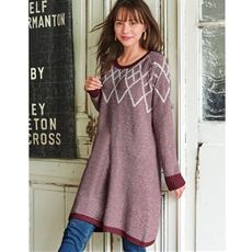 ふんわりとシルエットを作り出すチュニック丈のAラインニット。ダイヤ柄部分は普通よりも少し毛足の長いフェザー糸を使用して、ふんわりニュアンスをプラス。