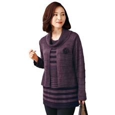 これ1枚でカーディガンを合わせているように見えるアンサンブル風のチュニック。お花のコサージュがアクセントになっています。