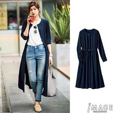 比翼仕立てのすっきりノーカラーワンピorボタンを開けて羽織りにも。今っぽムードのロング丈で、コーデしやすいネイビー。