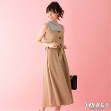 トレンチ風なボタンデザインのワンピースです。肩ひもは取り外し可能でベアワンピでも着用できます。共地のリボンでウエストマークするとスタイルアップ!今シーズンは長め丈がおすすめです。