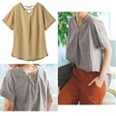 袖にゴムギャザーを寄せたふんわりブラウスは、さらっとした麻のような夏素材で快適。フロントのタックもアクセント。