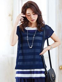 爽やかなブルーとホワイトの配色のタンクトップ、表面感のあるメッシュ素材のトップス、ネックレスの3点セット。