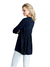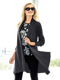 前身頃にスパンコールを編み込んだ上品なデザイン。ヒップが隠れるロング丈に、ショールカラーの縦のラインを効かせ、すっきりとスタイルアップして見えます。