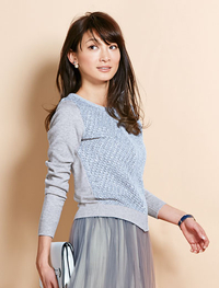 前身頃はツイード風の編地、袖は天竺編みで切替えたニットトップ。淡いブルーとグレーの配色が上品な印象を与えます。