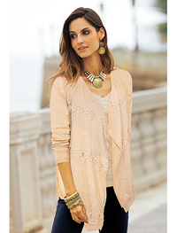 なめらかな肌触りのレーヨン混ニット素材。フロントは花柄の刺しゅうを施したメッシュ素材を重ねました。フロントのドレープが女性らしく、柔らかい雰囲気に。