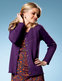 ケーブル編みで縦ラインを強調し、全身をすっきり見せ。ショールカラーにきちんと感があるので大人カジュアルに着こなせます。