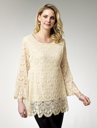 繊細なレースをボーダー状に配し、袖口と裾をスカラップ仕立てにした、リッチ感あふれるチュニック。広めの衿ぐり、少し広がった袖が女性らしさを強調。