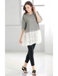 カジュアルテイストな杢調のミニ裏毛の生地に、大花レースを重ねて上品さをプラスし大人カジュアルを表現。