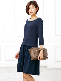凹凸感のある素材とフロントの衿ぐりビジューが上品で華やかなワンピース。ローウエストの切替えが体型カバーも叶えてくれます。