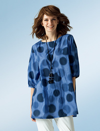 軽くサラッとした風合いのワッシャー加工したコットン混素材。ブルー系の大きめドット柄が爽やかな印象。ゆったりとして風通しのよいチュニックは着心地がよく体型カバー効果も。