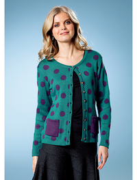 ヨーロッパテイスト薫る配色のドット柄がきれいな、ジャカードニットカーディガン。ポケットのデザインが甘さをプラス。