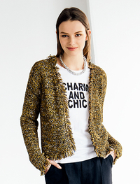 多色の糸でザックリと編み上げたニットカーディガン。前端や袖口、裾に配したフリンジが軽快感を演出。ノーボタンタイプで、サッとはおるだけでこなれた着こなしに。