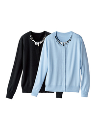 衿ぐりにクリアとグレーのビジューをあしらった華やかカーディガン。前のボタンを見せない仕様でおでかけ度がさらにアップ。