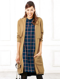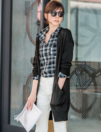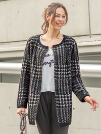 主張しすぎないチェック柄が大人の女性にぴったり。打合せが深めなのでブローチなどで留めてアウター風に着こなすのもおすすめ。