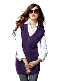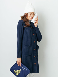 ケーブル編みで縦ラインを強調し、全身をすっきり見せ。ショールカラーにきちんと感があるので大人カジュアルに着こなせます。