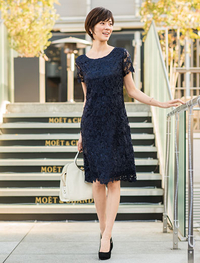 透け感のある袖がエレガントでリュクスな総レースワンピ。裏地はサテンジャージーを使用しストレッチ性があり着心地よく美しいシルエットを作ります。
