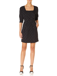 デコルテと袖をドット柄のメッシュで切替えフェミニンに。身頃はシフォン素材を重ねたティアードデザインで、ブラックが甘さをほどよく中和します。