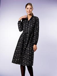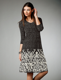 スカート部分のアラベスク模様が上品なジャージーワンピース。ストレッチ性が高く着心地がラクなうえ、落ち感があってシルエットもきれい。