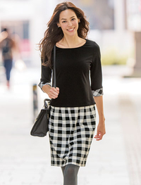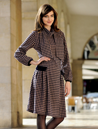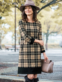 上部は無地、スカート部分と袖口を大柄のチェックプリントで切替えたワンピース。お揃いのスヌード付き。スヌードは無地とチェックのリバーシブル仕立てなのでお好みで組合せて。