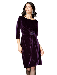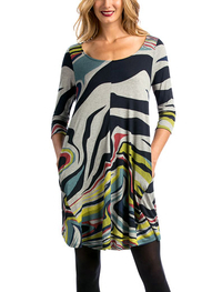 カシュクール風のデザインで、ウエスト部分でツイストしたドレープがスタイルを際立たせます。立体的なプリントは、上品な華やかさを演出します。
