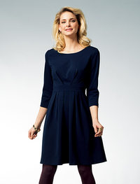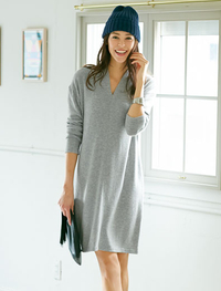 ほどよい落ち感と、柔らかな手触りが魅力のジャージーワンピース。後ろ衿ぐりも浅めのVネックになっているので、首元がすっきり見えます。