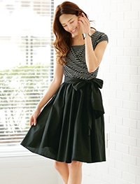 ウエストの太めのサテンリボンベルトがアクセント。グラデーションカラーとフレアーが絶妙なコンビネーションです。