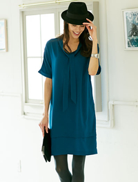 トレンドのボウタイリボンがアクセントになったサックワンピース。ハイネックインナーをインするコーディネートもおすすめです。