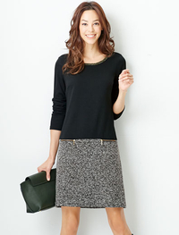 ツイード調のジャージー素材で切替えた上品なデザイン。ポケットのファスナーデザインや衿ぐりのブレードテープがアクセント。