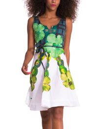 グリーンのハイビスカスの花が白地に映える爽やかなデザインのワンピースです。ジオメトリック柄との組み合わせが新鮮。
