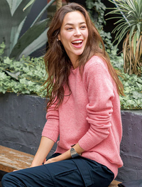 リラックスして着られるローゲージのゆったりめシルエット。シルク混の綿麻素材で肌触りもよく、素肌に着ても快適です。