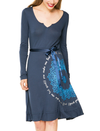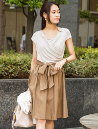 トップス部分はジャージー素材のカシュクール風デザイン、スカート部分は綿素材で切替えて美しいフィット&フレアーシルエットに仕上げました。