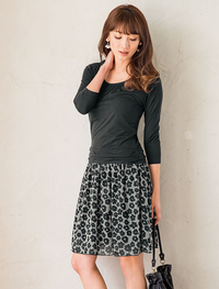 ウエスト部分にお花のようなビジューをあしらい、華やかさを底上げ。ジャージー素材で着心地抜群ながら、きちんと見える1枚です。