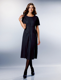 ペンシルストライプでスレンダーに見せる長め丈のワンピース。バイヤス使いの袖や、配色ネックラインなど、トラッドな柄を女性らしいデザインにアレンジしました。