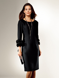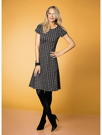 伸縮性のあるフクレジャカードを使用した人気の千鳥柄ワンピース。美シルエットに衿ぐりのパイピングでアクセントを。