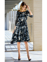 抽象的なフラワーモチーフが印象的なジャージーワンピース。サイドからのオーバーラップをフロントで結べば、気になるおなか回りをすっきりとカバー。