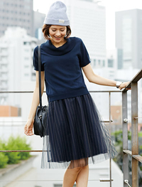トップスはアイレットをあしらったオフタートルの綿混ニット。上身頃に肌触りのよい綿混ジャージー、スカート部分にチュールを重ねたアンダードレス付です。