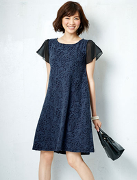 袖に高級感のあるレースをあしらったジャージーワンピース。袖にも裏地が付いているので1枚で軽やかに着こなせます。