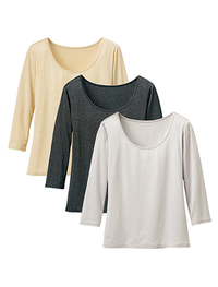 暑い時は涼しく、寒い時は暖かいクラボウインターナショナル「ルナセル」素材を使用。前身頃は二重にし、気になる下着の透けやラインの響きを抑える仕立てです。