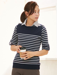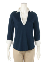 初秋に着回しが利くスクエアネックのボーダーカットソー。シャツ生地を使用した衿元のデザインがポイント。