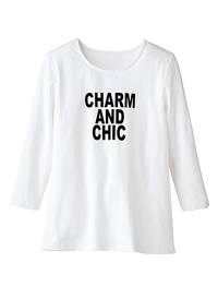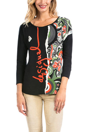 手書き風の文字が大胆にデザインされた個性的なトップです。華やかな柄使いを黒が引き締めてくれます。