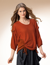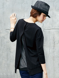 裏パイルのジャージートップの裾から、エンブロイダリーを施した布帛をのぞかせてフェイクレイヤードに仕上げました。1枚でフェミニンに決まります。