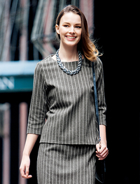 上品なグレーにホワイトのピンストライプが都会的な印象を漂わすトップ。ほどよい厚みがあり、伸縮性のあるストレッチジャージー素材で、着やすいのも魅力です。