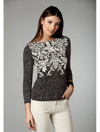 ヘリンボーン柄とアラベスク模様が素敵なジャージートップ。ボートネックがデコルテを美しく見せ、柄の白さが顔映りを明るく華やかに。