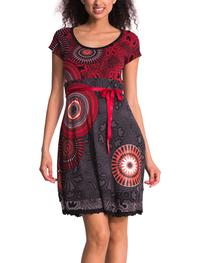 デシグアルで人気のデザインをシックなレッド系でまとめた上品なデザインのワンピース。サークルプリントをアシンメトリーに配置しています。