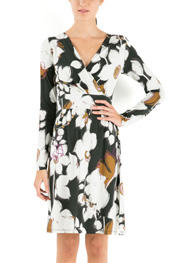 大柄のフラワープリントのワンピースはカシュクール風のデザインで胸元を美しく見せます。優しいドレープがフェミニンなジャージワンピースです。