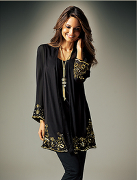 前身頃は二枚重ね、袖口は配色使いにした凝ったデザイン。軽やかにはおるだけで洗練された雰囲気に。