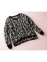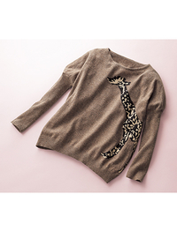 上品なトップ調カラーの前身頃にキリン柄をデザイン。ボックス風のゆったりシルエットの身頃に、袖はパフスリーブ風からリブ切替えですっきりと。