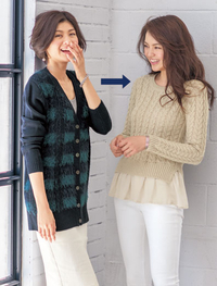 前身頃の横向きのケーブル編みや、編み地を切替えた袖のデザインなどアイキャッチなディテールが満載。ゆったりめでレイヤードにもおすすめです。