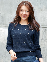 前身頃にあしらった小花調のビジューが華やかさを底上げ。緩く編み込まれた同系色のメランジ糸が上質感をプラスします。