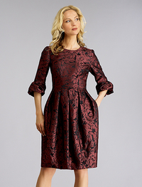 スカート部分をふんわりさせ、袖にアクセントをつけた女性らしさが際立つワンピース。ワインカラーのジャカード織りも上品。